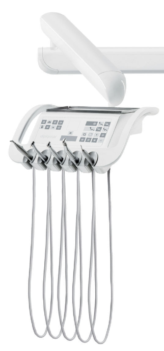 Stolik lekarza z dolnym prowadzeniem rękawów został wyposażony w narzędzia firmy DENSIM. Ekran pojemnościowy zapewnia łatwą nawigację i sterowanie funkcjami unitu, a jego gładką szklaną powierzchnię można czyścić bez wysiłku. Pantograficzne ramię stolika występuje w wersji standardowej oraz skrócone.